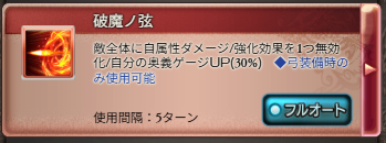 フルオートだと敵の確率回避が厄介のため、剣豪の極致の証技「破魔ノ弦」をセット。他ジョブならディスペルでも良いが、このアビリティなら自分の奥義ゲージも増やせる。